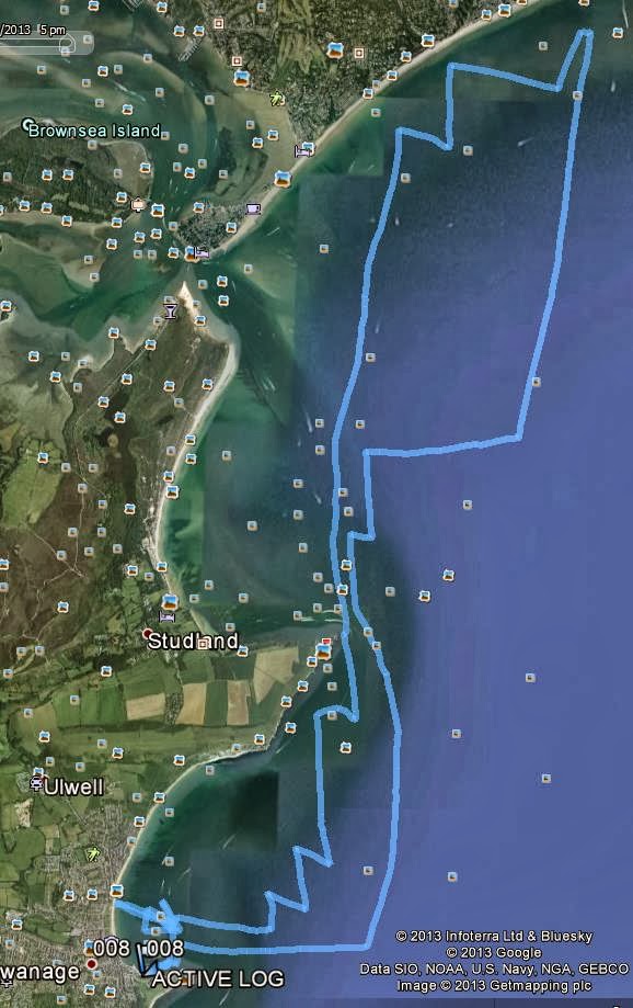 we rounded bournmouth mark after almost 95 mins doing about 5-6 knts the whole way. upwind we headed out to sea and then tacking for the port 2 bouy to head home. greg caught us up at this mark and then going over old harry we pulled away slightly, we headed back at to sea and greg went in.